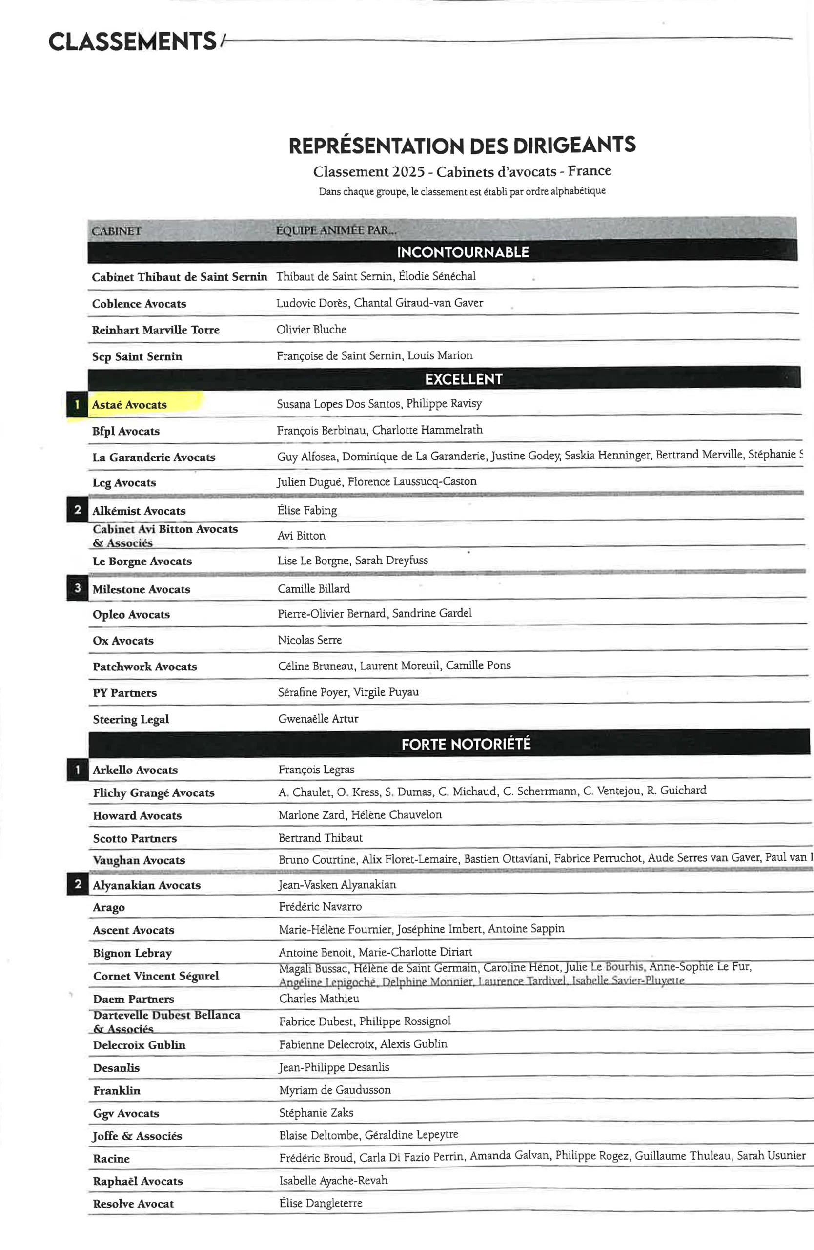 Astaé-Avocats est une nouvelle fois classé parmi les tous meilleurs cabinets d’avocats dans la catégorie « Représentation des dirigeants ».